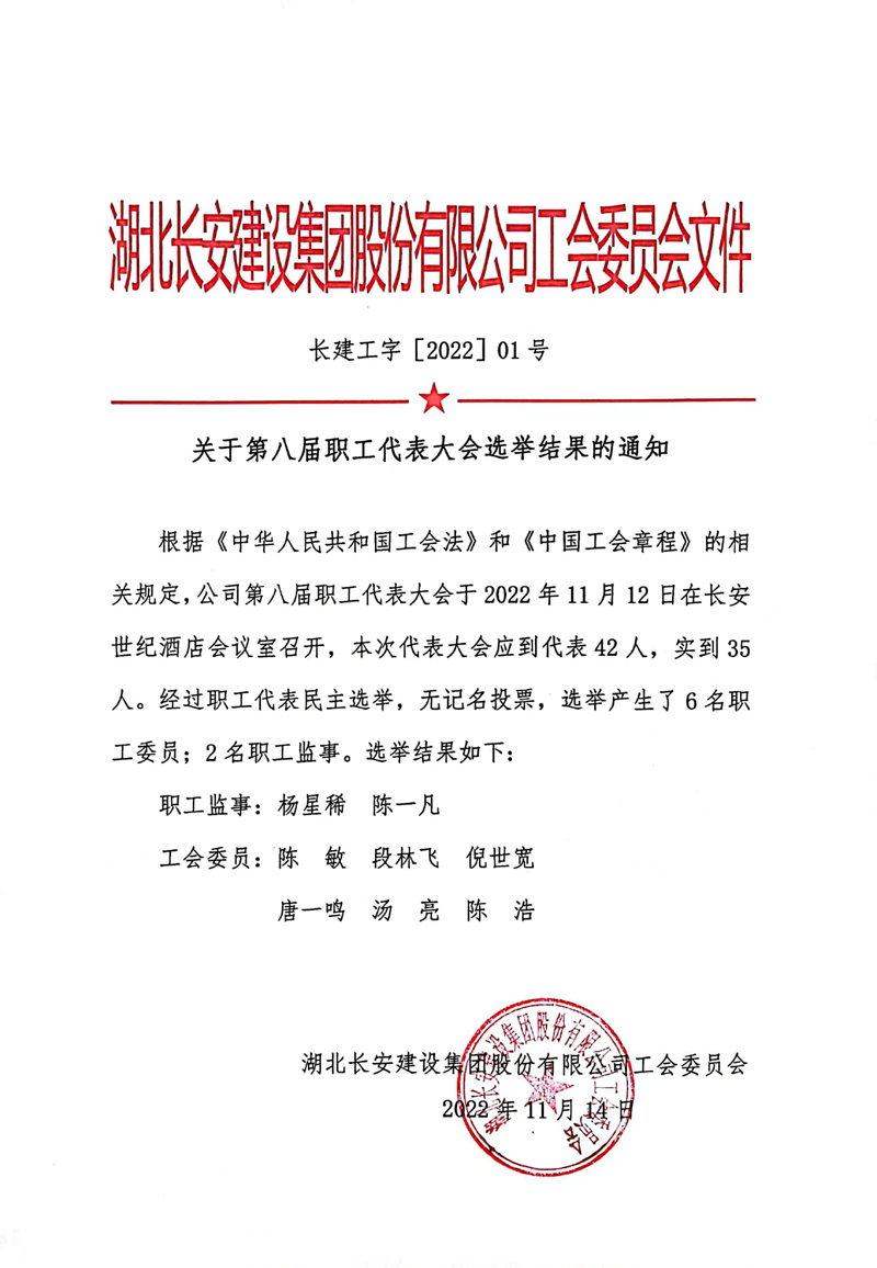 湖北長安建設集團第八屆第一次職工代表大會選舉結(jié)果公告