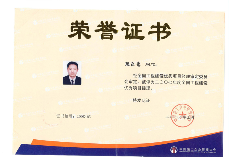 2007年度全國(guó)工程建設(shè)優(yōu)秀項(xiàng)目經(jīng)理(段樂意)