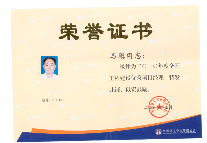 2010年度全國(guó)工程建設(shè)優(yōu)秀項(xiàng)目經(jīng)理(馬驥)