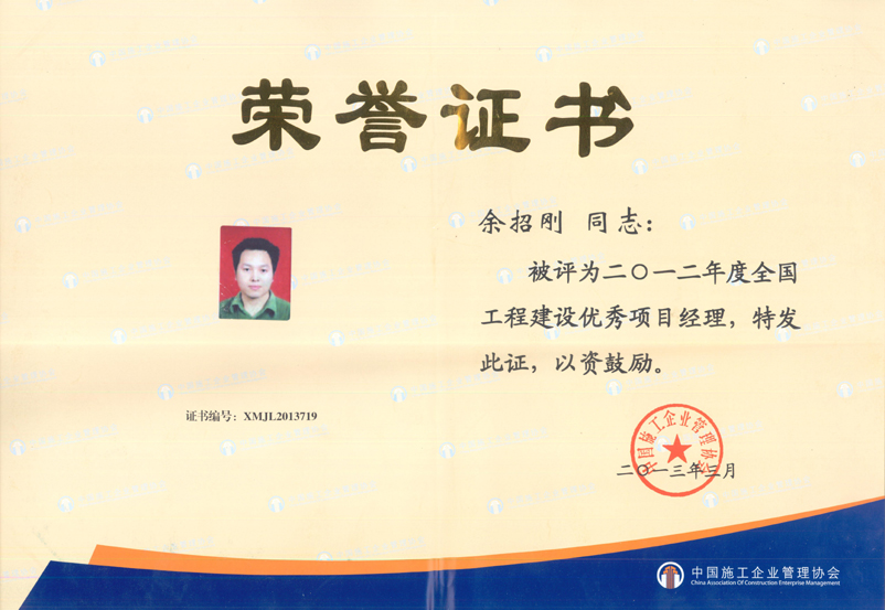 2012年度全國(guó)工程建設(shè)優(yōu)秀項(xiàng)目經(jīng)理(余招剛)