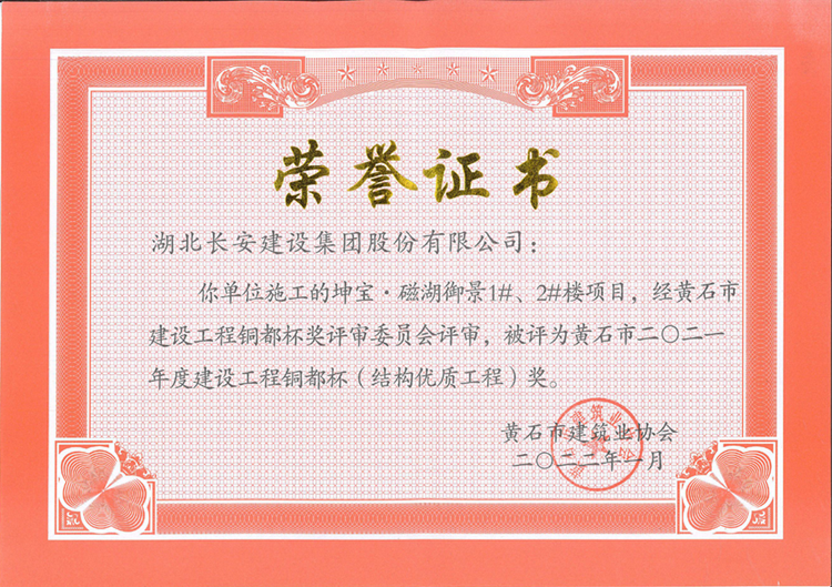 黃石坤寶?磁湖御景1#、2#樓項目榮獲結構優質工程和安全文明施工現場