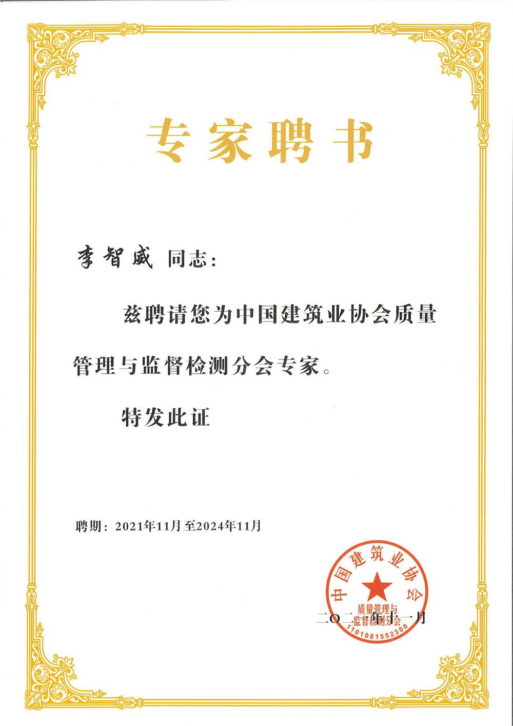 李智威被聘為中國建筑業協會質量監督檢測分會專家