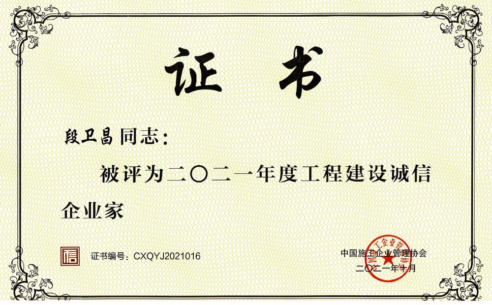 段衛(wèi)昌榮獲2021年度工程建設(shè)誠信企業(yè)家稱號