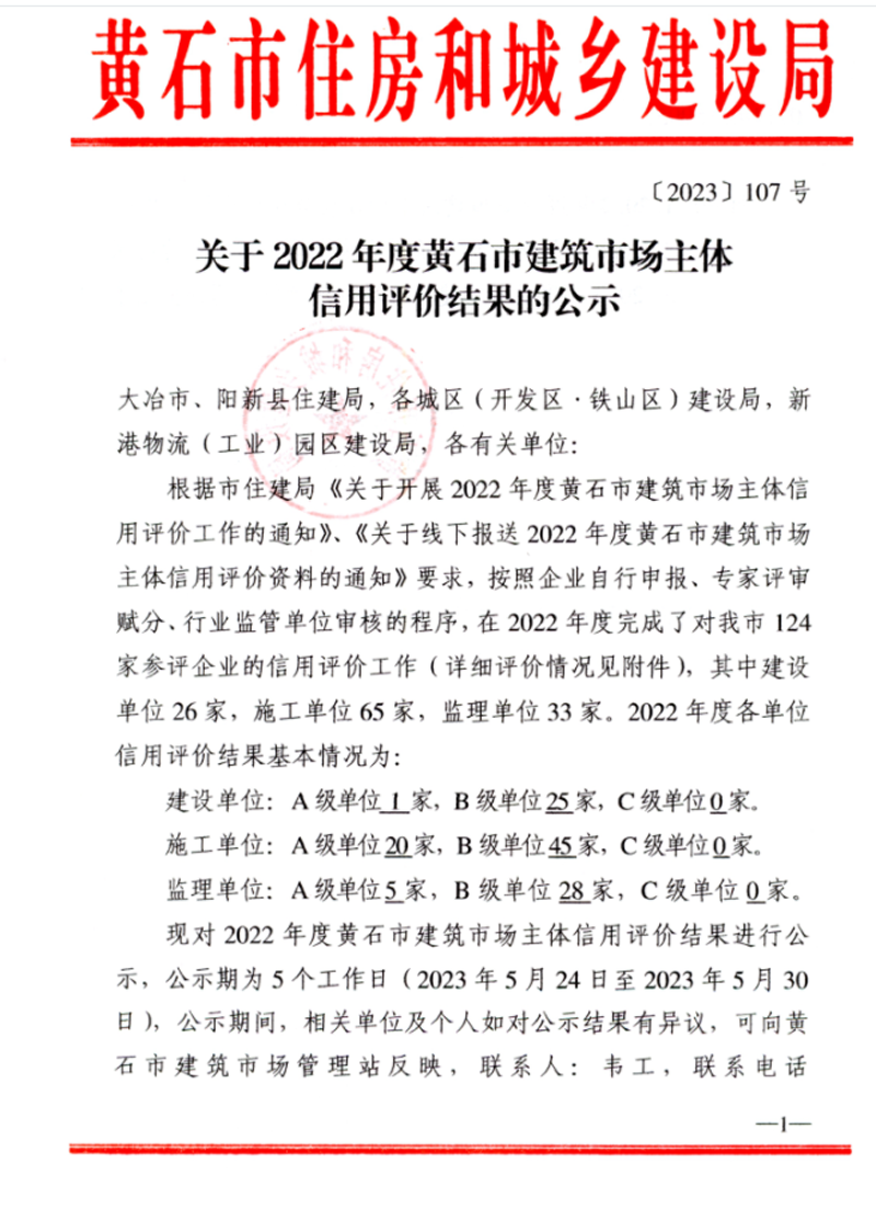 集團公司被黃石市住建局評為建筑市場主體信用A級單位