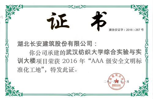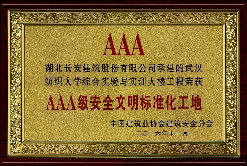 武漢紡織大學綜合實驗實訓大樓AAA級安全文明標準化工地2016(獎牌)