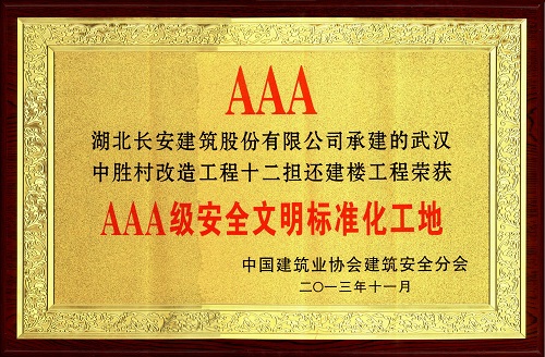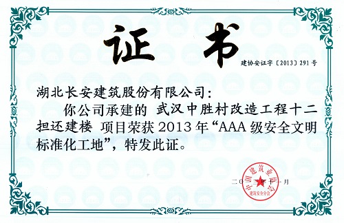 武漢中勝村改造工程十二擔還建樓被評為AAA級安全文明標準化工地證書2013