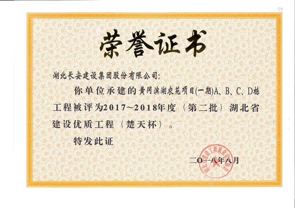 黃岡濱湖農(nóng)苑項(xiàng)目(一期)ABCD棟工程被評為2017-2018年度(第二批)湖北省建設(shè)優(yōu)質(zhì)工程(楚天杯)