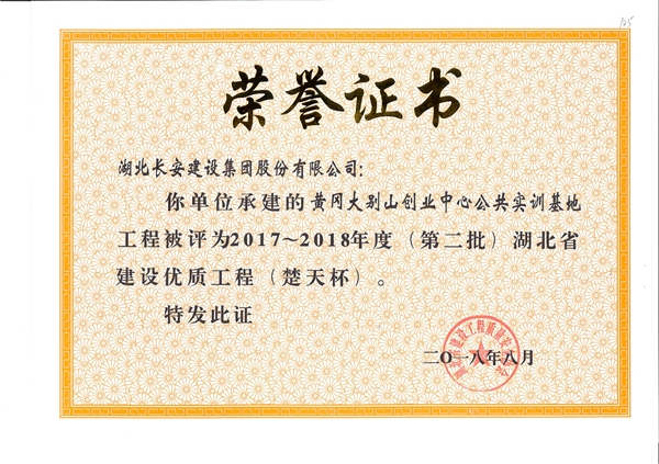 黃岡大別山創(chuàng)業(yè)中心公共實(shí)訓(xùn)基地工程被評為2017-2018年度(第二批)湖北省建設(shè)優(yōu)質(zhì)工程(楚天杯)