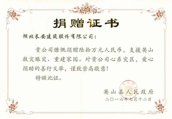 60萬(wàn)元抗洪救災(zāi)捐贈(zèng)證書2016
