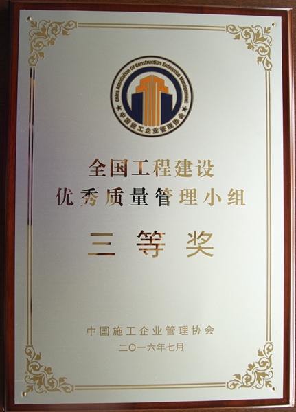 公司及QC小組榮獲2016年度全國(guó)工程建設(shè)優(yōu)秀質(zhì)量管理小組三等獎(jiǎng)(內(nèi)墻抹灰材料及施工工藝創(chuàng)新)獎(jiǎng)牌