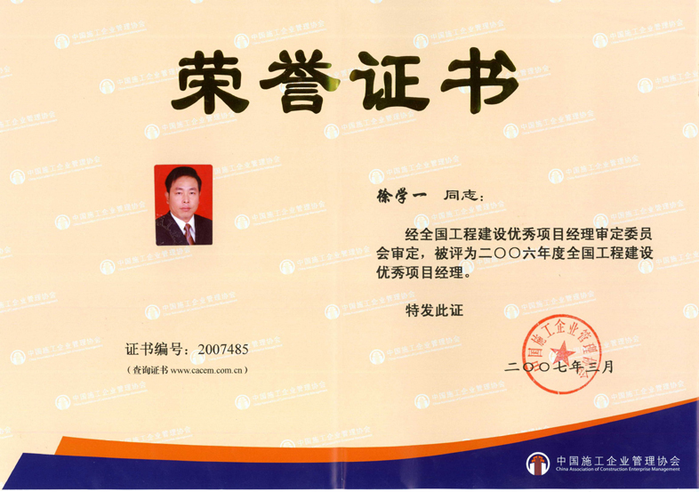 2006年度全國工程建設優秀項目經理(徐學一)