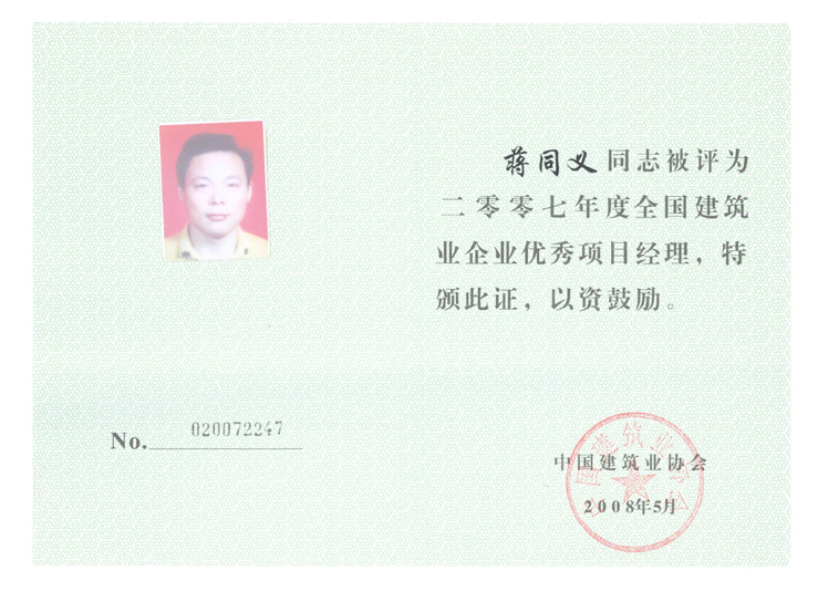 2007年度全國建筑業企業優秀項目經理(蔣同義)