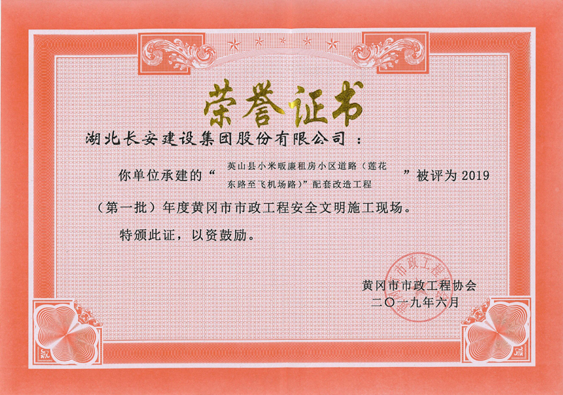 英山縣小米畈廉租房小區(qū)道路配套改造工程獲2019年度黃岡市市政工程安全文明施工現(xiàn)場