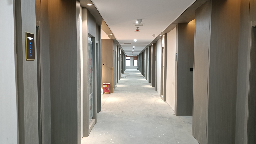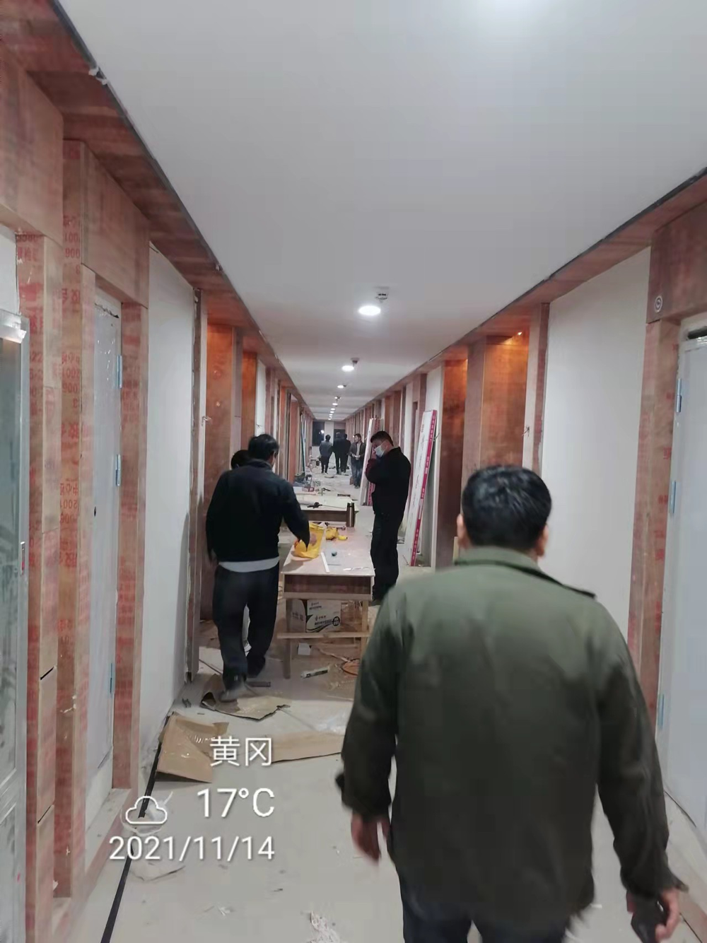 該隔離點(diǎn)搶建工程共計(jì)6層,總建筑面積6600m2,而且時(shí)間緊、任務(wù)重、裝修檔次較高。設(shè)計(jì)內(nèi)墻涂料、木飾面板、墻布、軟包、壁畫(huà)、硬包、不銹鋼線條、木門、防火門、復(fù)合地板、人造石、淋浴房、開(kāi)關(guān)、燈具、潔具、消防、電視、監(jiān)控等,點(diǎn)多面廣,綜合管理難度較大。項(xiàng)目各班組采取晝夜連續(xù)施工的方式,加緊建設(shè)。長(zhǎng)安建設(shè)集團(tuán)積極整合資源,組織200余名精干職工從早晨6;00--晚上23:00不間斷施工,確保原約定2個(gè)月完成的施工任務(wù)在短短的10天內(nèi)保質(zhì)保量完成。
