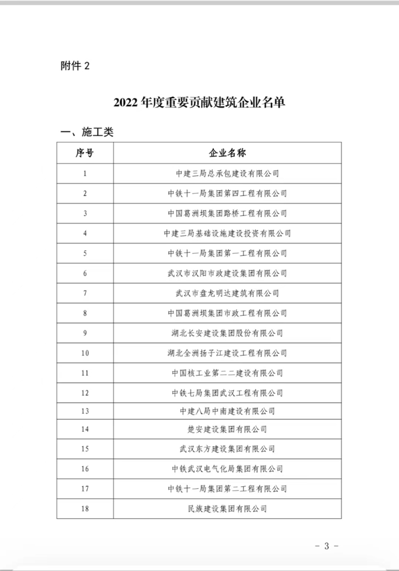 2月20日,湖北省住建廳官網發布《關于對2022年度優秀建筑企業進行表揚的通報》,集團公司榮獲“2022年度重要貢獻建筑企業”(施工類)榮譽稱號,位列第9名。