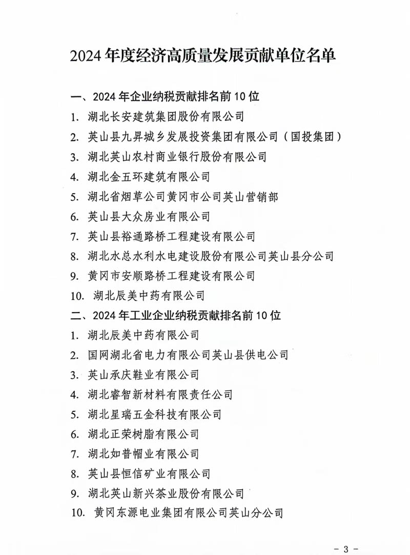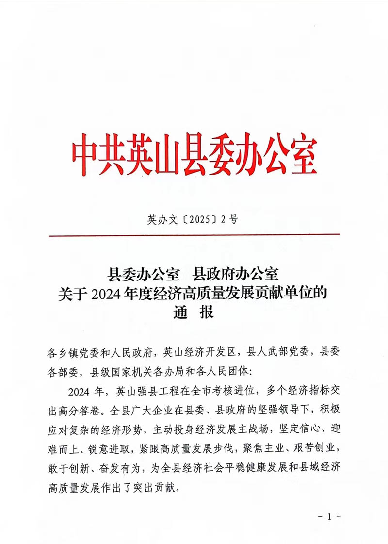 2月10日,英山縣2025年三級干部會議在英山縣禮堂召開。集團公司榮庸“2024年度經濟高質量發展貢獻單位”稱號,在“2024年企業納稅貢獻排名前10位”中榮居第1位。