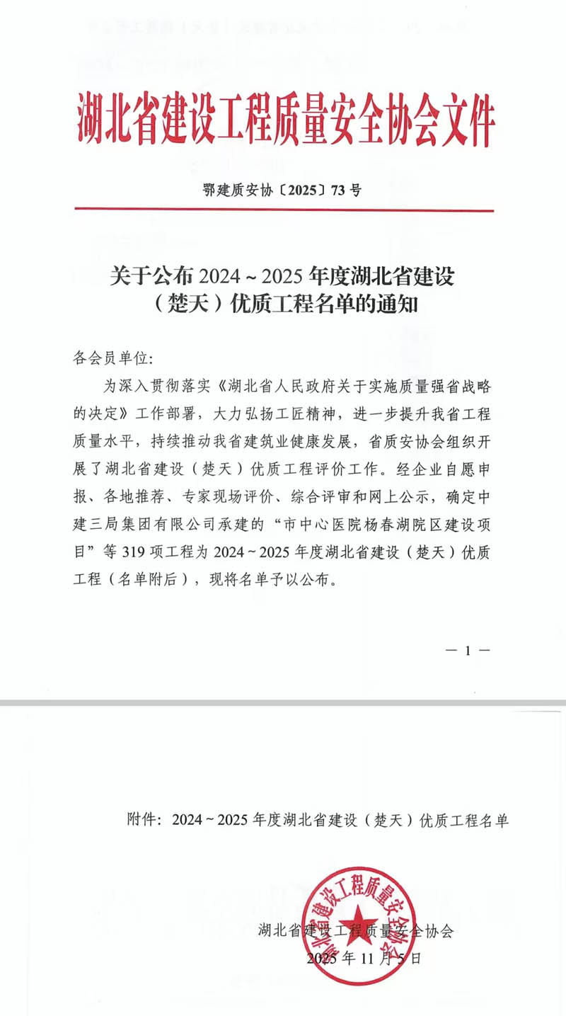 11月5日,湖北省建設(shè)工程質(zhì)量安全協(xié)會(huì)公布2024-2025年度湖北省建設(shè)(楚天)優(yōu)質(zhì)工程名單,全省共319個(gè)工程上榜。湖北長(zhǎng)安建設(shè)集團(tuán)股份有限公司施工建設(shè)的中勝村城中村改造C產(chǎn)業(yè)地塊、新建居住公園綠地項(xiàng)目(東風(fēng)村城中村改造K3地塊)1#樓及地下室、黃岡職業(yè)技術(shù)學(xué)院新校區(qū)擴(kuò)建項(xiàng)目一期(實(shí)訓(xùn)樓、圖書館)等9項(xiàng)工程獲評(píng)該榮譽(yù),獲獎(jiǎng)?wù)急燃s2.82%。