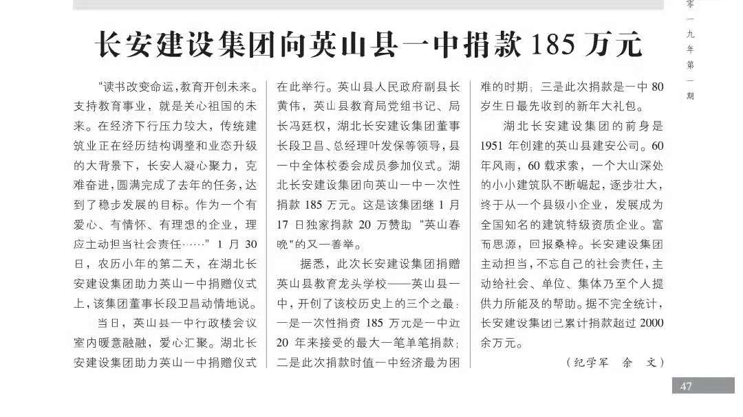 長安建設集團向英山縣一中捐款185萬元