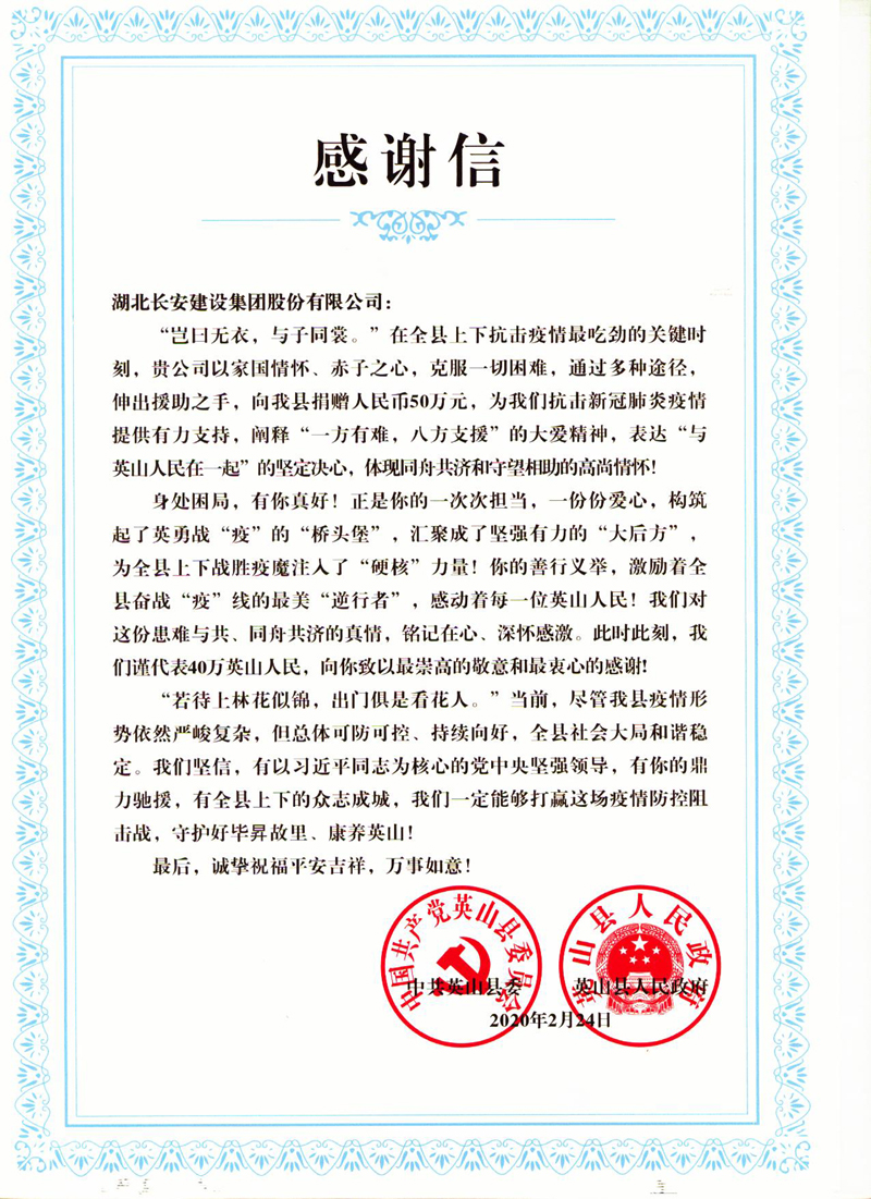 英山縣人民政府致集團(tuán)的抗疫捐贈(zèng)感謝信
