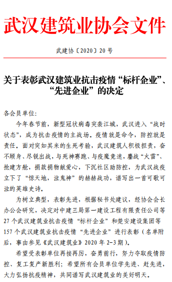 集團(tuán)公司被武漢建筑業(yè)協(xié)會(huì)評為抗擊疫情“先進(jìn)企業(yè)”