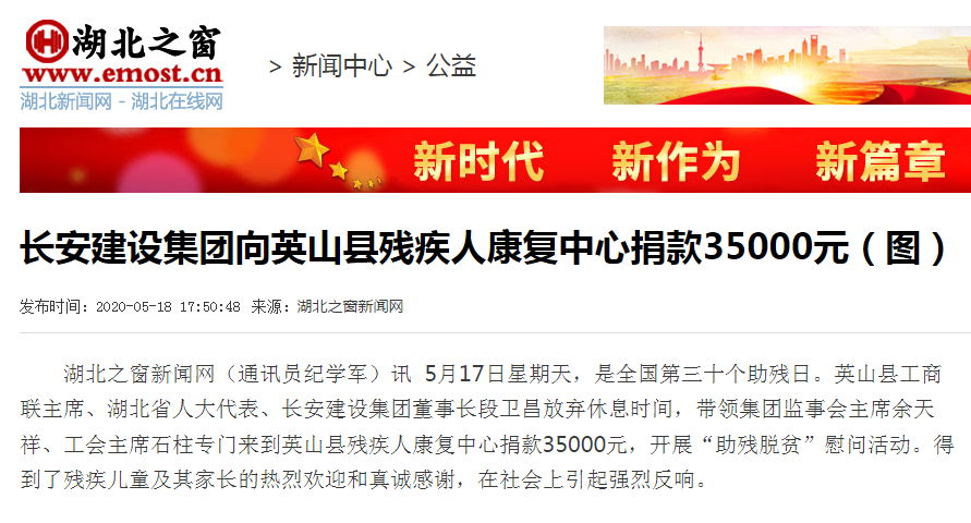 長安建設集團向英山縣殘疾人康復中心捐款35000元