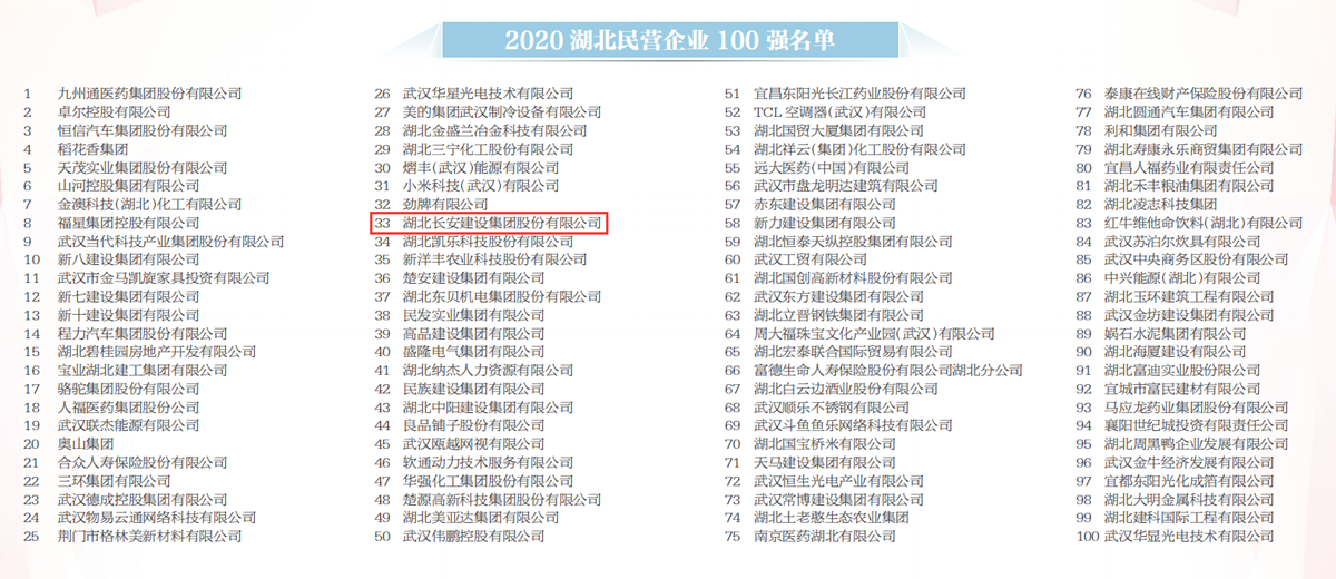 據湖北日報消息,10月13日,湖北省工商聯發布2020湖北民營企業100強、制造業100強和服務業20強名單。湖北長安建設集團股份有限公司位列第33位。