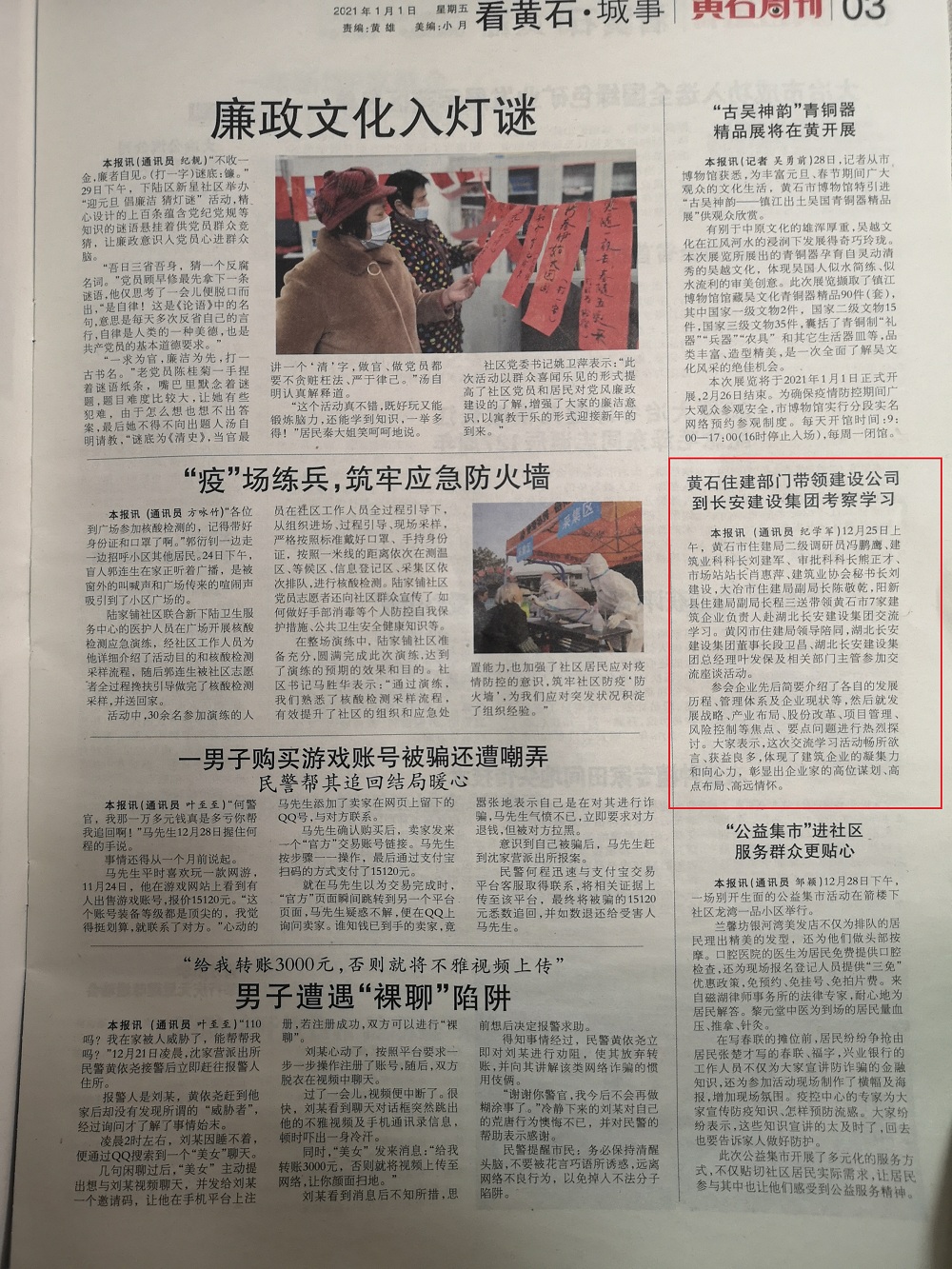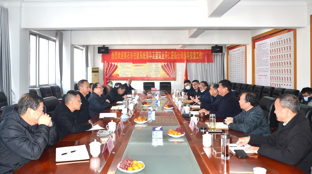 為加強住建系統的企業交流合作,共同促進建筑業高質量發展,12月25日上午,黃石市住建局二級調研員馮鵬鷹、建筑業科科長劉建軍、審批科科長熊正才、市場站站長肖惠萍、建筑業協會秘書長劉建設,大冶市住建局副局長陳敬乾,陽新縣住建局副局長程三送帶領黃石市7家建筑企業負責人赴湖北長安建設集團交流學習。黃岡市住建局總工劉俊、建筑業科科長徐宏、英山縣住建局局長黃威陪同。湖北長安建設集團董事長段衛昌、總經理葉發保及相關部門主管參加交流座談活動。